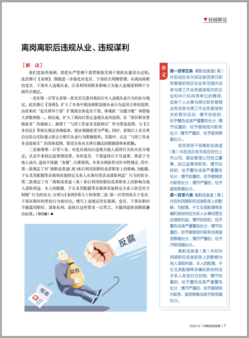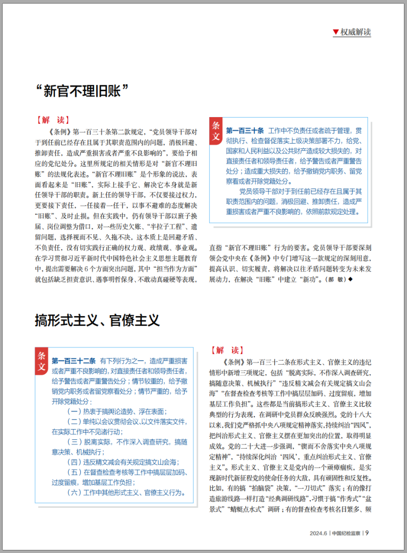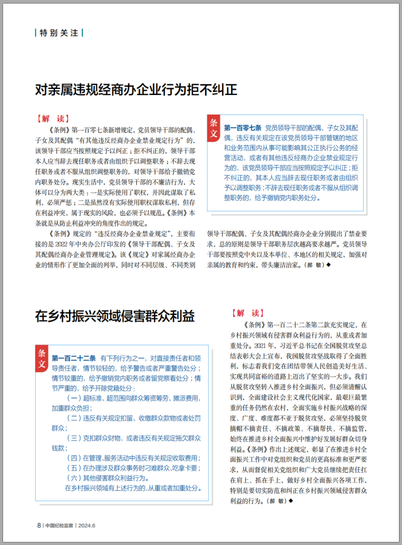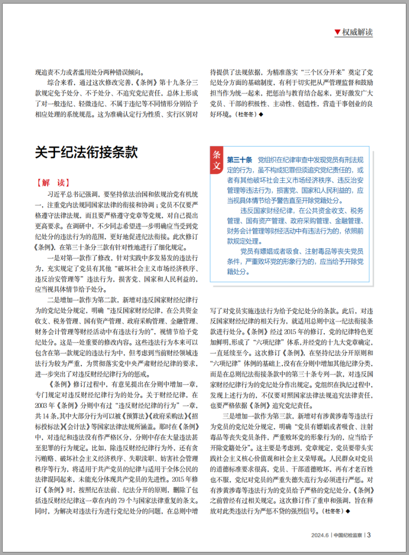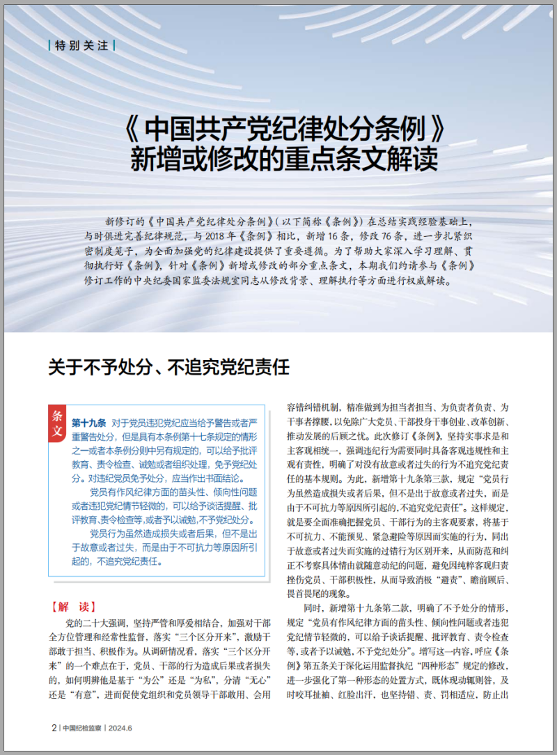 新修訂的《中國共產(chǎn)黨紀律處分條例》(以下簡稱《條例》)在總結實踐經(jīng)驗基礎上,與時俱進完善紀律規(guī)范,與 2018 年《條例》相比,新增 16 條,修改 76 條,進一步扎緊織密制度籠子,為全面加強黨的紀律建設提供了重要遵循。為了幫助大家深入學習理解、貫徹執(zhí)行好《條例》,針對《條例》新增或修改的部分重點條文,本期我們約請參與《條例》修訂工作的中央紀委國家監(jiān)委法規(guī)室同志從修改背景、理解執(zhí)行等方面進行權威解讀。
