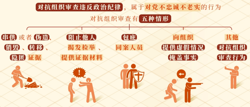 《中國共產(chǎn)黨紀(jì)律處分條例》第六十三條規(guī)定了對抗組織審查,應(yīng)予處分的五種情形:串供或者偽造、銷毀、轉(zhuǎn)移、隱匿證據(jù);阻止他人揭發(fā)檢舉、提供證據(jù)材料;包庇同案人員;向組織提供虛假情況,掩蓋事實;其他對抗組織審查行為。
