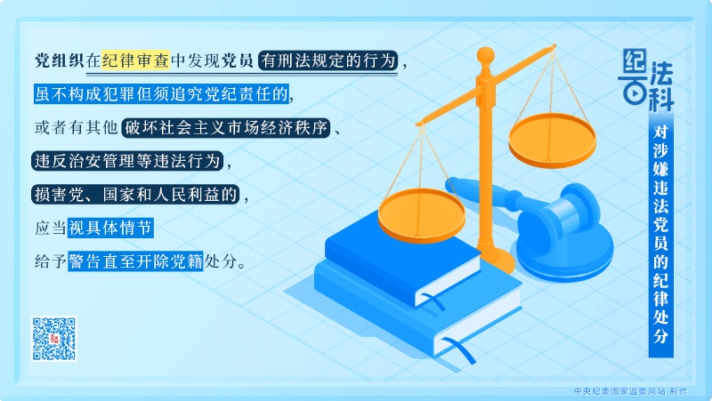 《中國(guó)共產(chǎn)黨紀(jì)律處分條例》第三十條分三款對(duì)黨組織在紀(jì)律審查中發(fā)現(xiàn)黨員涉嫌違法如何追究黨紀(jì)責(zé)任作出規(guī)定。其中,第一款規(guī)定,黨組織在紀(jì)律審查中發(fā)現(xiàn)黨員有刑法規(guī)定的行為,雖不構(gòu)成犯罪但須追究黨紀(jì)責(zé)任的,或者有其他破壞社會(huì)主義市場(chǎng)經(jīng)濟(jì)秩序、違反治安管理等違法行為,損害黨、國(guó)家和人民利益的,應(yīng)當(dāng)視具體情節(jié)給予警告直至開(kāi)除黨籍處分。