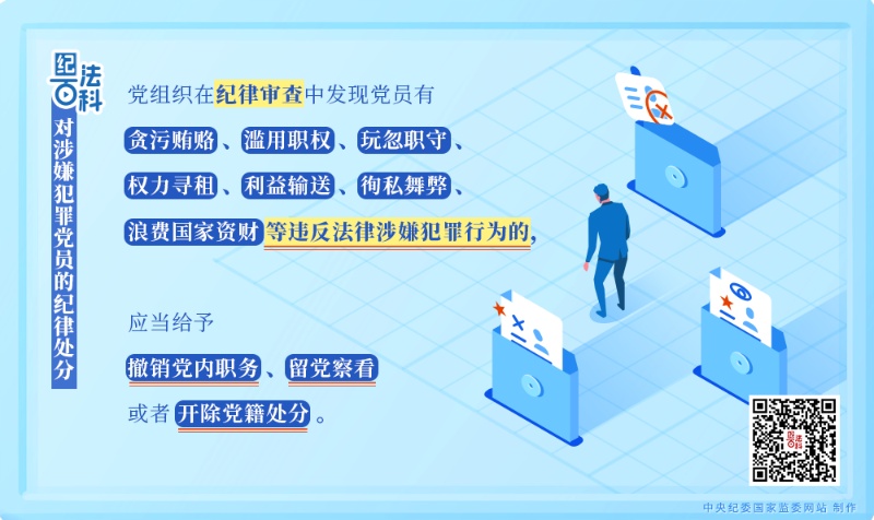 第二十九條規(guī)定,黨組織在紀(jì)律審查中發(fā)現(xiàn)黨員有貪污賄賂、濫用職權(quán)、玩忽職守、權(quán)力尋租、利益輸送、徇私舞弊、浪費(fèi)國家資財?shù)冗`反法律涉嫌犯罪行為的,應(yīng)當(dāng)給予撤銷黨內(nèi)職務(wù)、留黨察看或者開除黨籍處分。