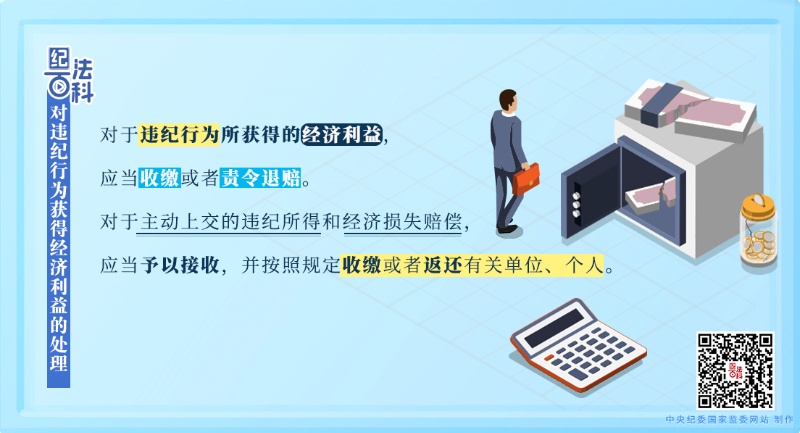 《中國共產(chǎn)黨紀(jì)律處分條例》第四十三條規(guī)定:對于違紀(jì)行為所獲得的經(jīng)濟(jì)利益,應(yīng)當(dāng)收繳或者責(zé)令退賠。對于主動上交的違紀(jì)所得和經(jīng)濟(jì)損失賠償,應(yīng)當(dāng)予以接收,并按照規(guī)定收繳或者返還有關(guān)單位、個人。