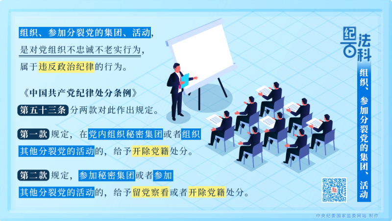 《中國(guó)共產(chǎn)黨紀(jì)律處分條例》第五十三條分兩款對(duì)此作出規(guī)定。第一款規(guī)定,在黨內(nèi)組織秘密集團(tuán)或者組織其他分裂黨的活動(dòng)的,給予開(kāi)除黨籍處分。第二款規(guī)定,參加秘密集團(tuán)或者參加其他分裂黨的活動(dòng)的,給予留黨察看或者開(kāi)除黨籍處分。