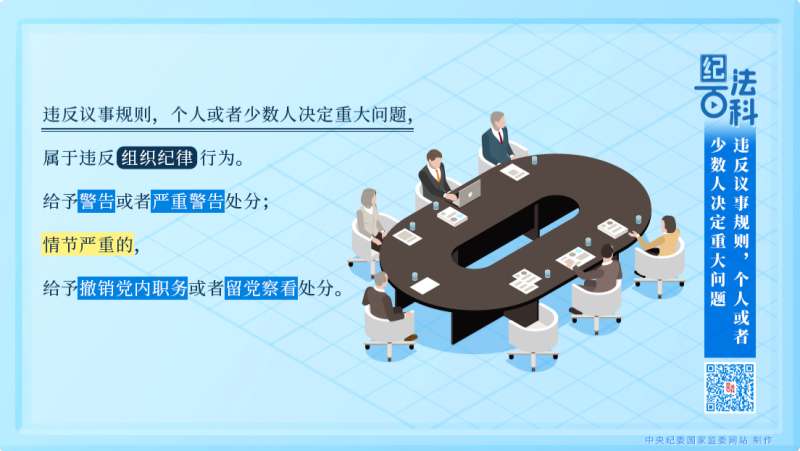 《中國共產(chǎn)黨紀(jì)律處分條例》第七十七條規(guī)定了違反民主集中制原則的四種情形,其中之一就是違反議事規(guī)則,個(gè)人或者少數(shù)人決定重大問題?!稐l例》規(guī)定,對該違紀(jì)行為,給予警告或者嚴(yán)重警告處分;情節(jié)嚴(yán)重的,給予撤銷黨內(nèi)職務(wù)或者留黨察看處分。