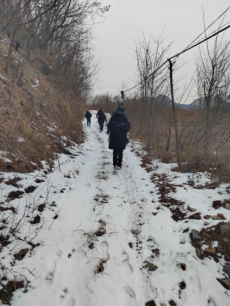 本次塘壩排查工作時(shí)間緊、任務(wù)重,排查期間多次遭遇風(fēng)雪惡劣天氣,且多數(shù)塘壩都是20世紀(jì)60至70年代所建,防汛道路均為狹窄土路,交通極為不便。安全隱患排查的一周時(shí)間里,項(xiàng)目組成員穿著厚厚的羽絨服,日行兩萬余步,翻山越嶺,迎風(fēng)雪,戰(zhàn)泥濘,穿叢林荊棘。每日高強(qiáng)度徒步在田野山地間,白天在溢洪道里、堤頂和堤腳上定位、測(cè)量高程、拍照,晚上組長(zhǎng)整理當(dāng)天記錄的信息和問題,組員整理航拍影像,勘測(cè)同事整理位置信息并將點(diǎn)位按照排查順序點(diǎn)在奧維地圖上,涉及的內(nèi)容繁多,每個(gè)組都是白天忙外業(yè),晚上忙內(nèi)業(yè)。排查期間,郭曉鎮(zhèn)感冒生病,李子民走山路摔傷了膝蓋,趙連濤去壩腳測(cè)量定位時(shí)被異物扎傷了腳踝,第二小組在前往塘壩途中乘坐村內(nèi)的電動(dòng)三輪車發(fā)生了側(cè)翻……天氣寒冷、雪花飄灑,山地里的雪亦未消融,回想起在泥濘的鄉(xiāng)村路上我們乘車前往塘壩現(xiàn)場(chǎng)時(shí),途中盤山彎路很多,每次快要抵達(dá)目的地時(shí),車載導(dǎo)航都會(huì)提醒:“今日走過了所有的彎路,從此人生盡是坦途!”每當(dāng)聽到這句話都讓我們精神振奮,是啊,人生道路上總會(huì)遇到彎路,可是再長(zhǎng)的彎路,也總會(huì)有平坦的時(shí)候,路就在前方!