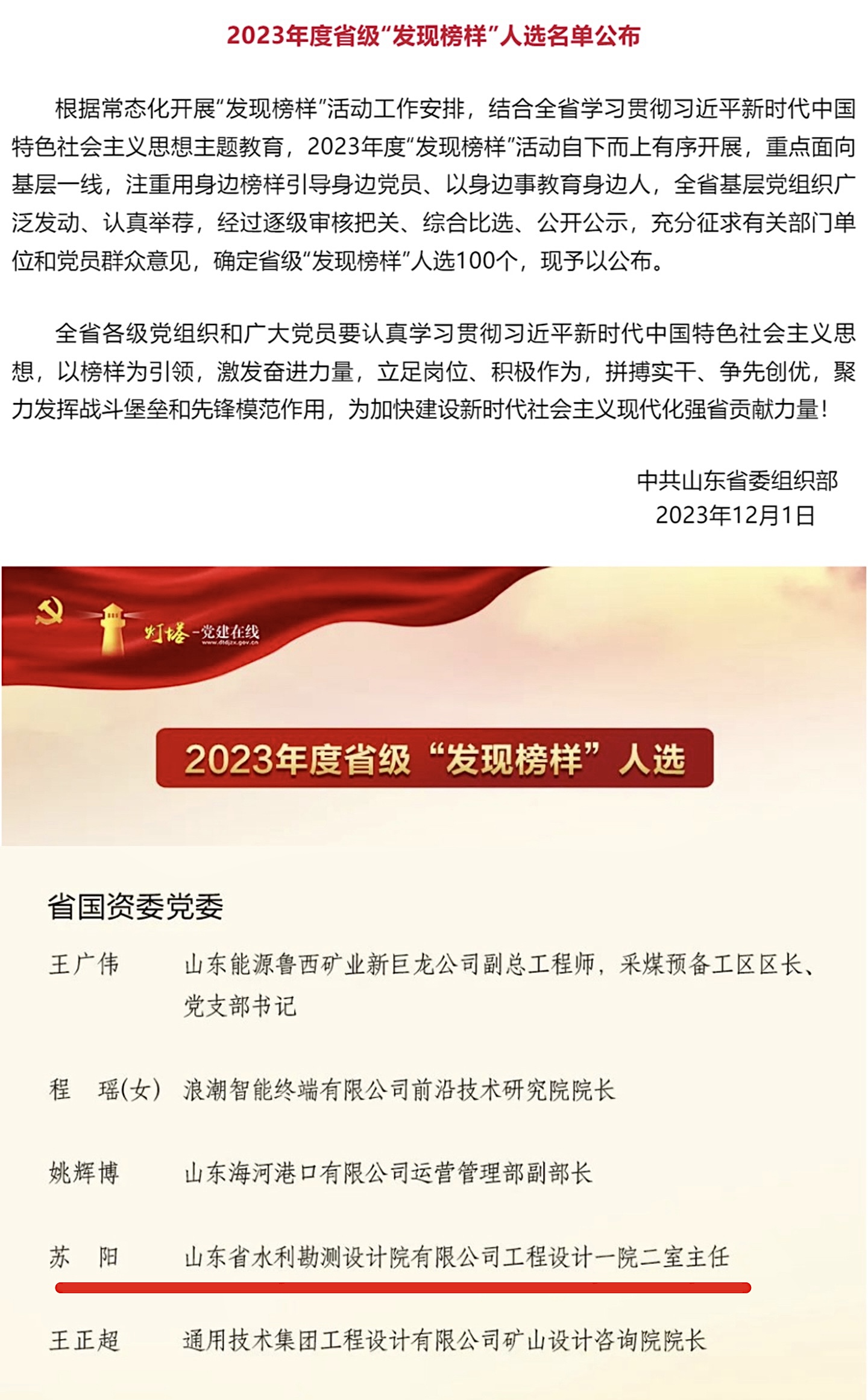 近日,中共山東省委組織部公布2023年度省級(jí)“發(fā)現(xiàn)榜樣”人選名單,山東省水利勘測(cè)設(shè)計(jì)院有限公司(簡(jiǎn)稱山東水設(shè))蘇陽(yáng)入選。